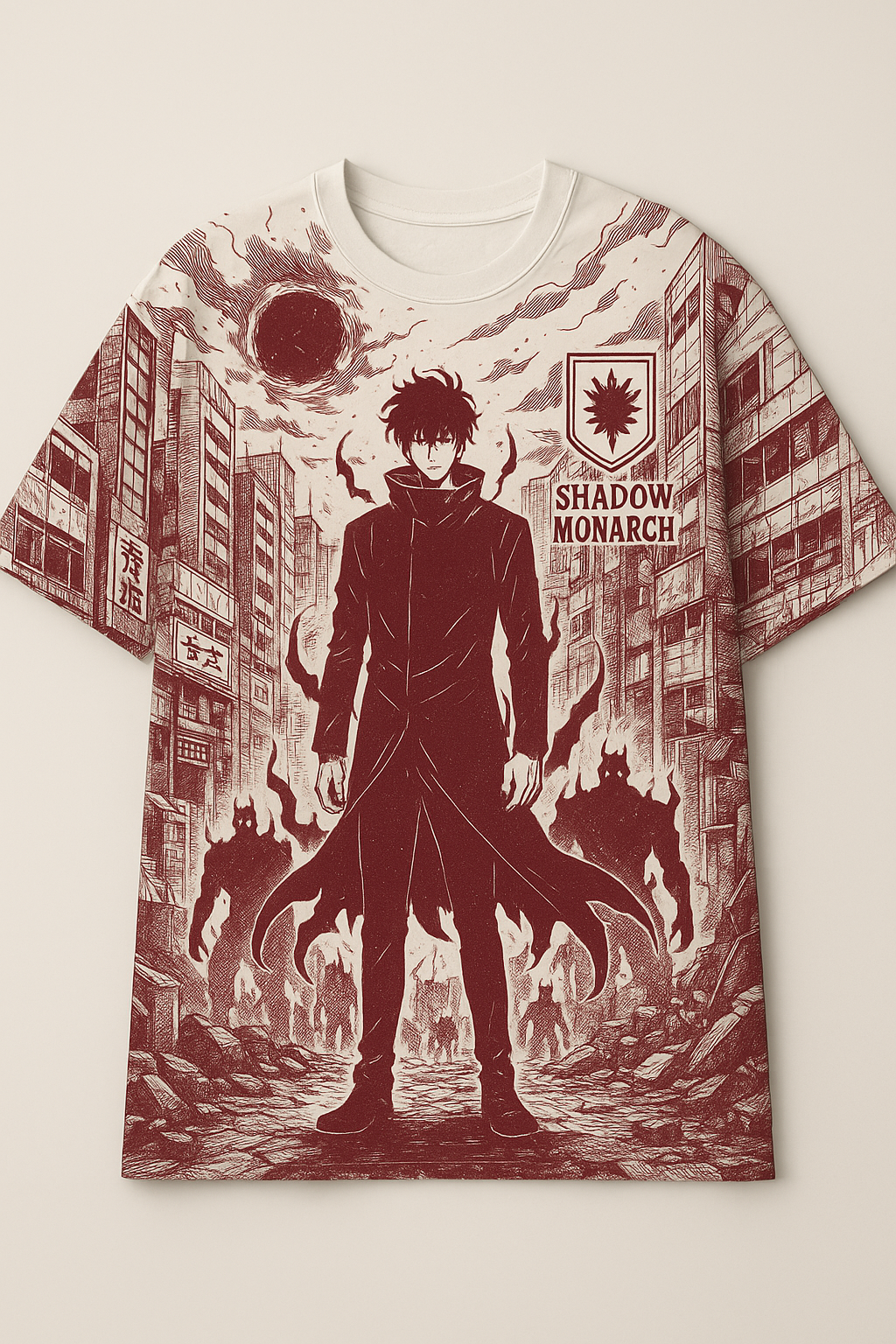 Command your army of shadows in style with this oversized T-shirt featuring Sung Jin-Woo from Solo Leveling. With a powerful manga illustration of the Shadow Monarch walking through a crumbling city, surrounded by his summoned beasts, this design embodies dominance, mystery, and unmatched strength.