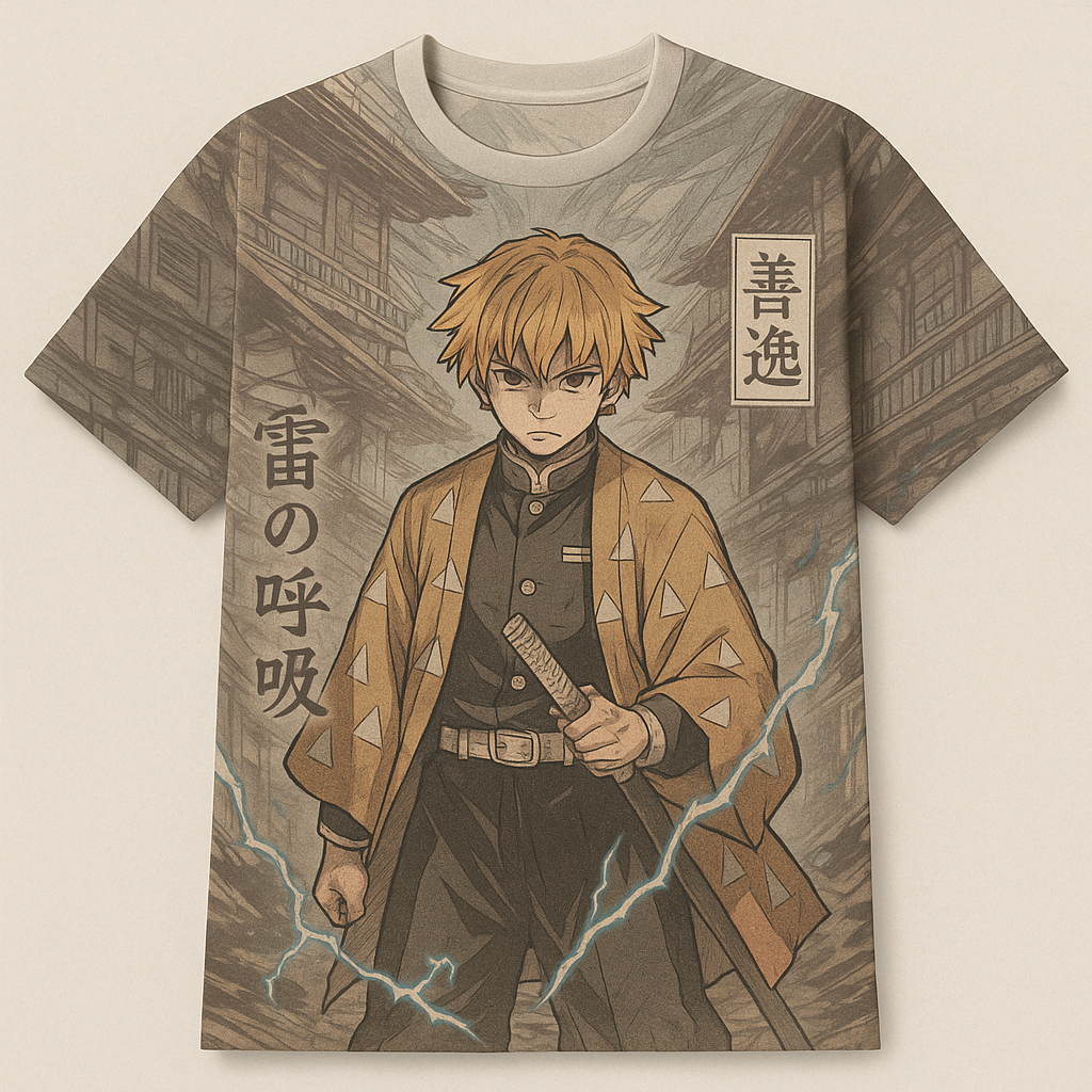 Feel the storm building with this powerful oversized T-shirt featuring Zenitsu Agatsuma from Demon Slayer. Set in a dramatic Edo-era street with lightning striking around him, this design captures Zenitsu’s fierce determination and his iconic Thunder Breathing stance in full manga style.